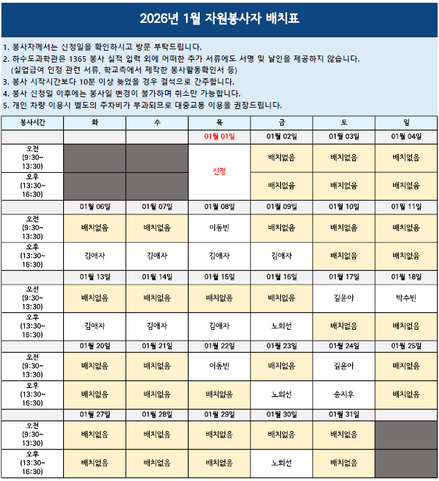 | 첨부 | 1월 일일자원봉사자 배치표.pdf (281,738 byte) | ||||