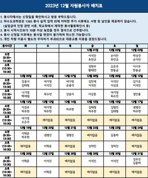 ![]() *봉사내용 : 1) 전시실 질서유지 / 2) 교육준비 보조 / 3) 도서정리 봉사 등 기타 사무 보조 ★ 1365자원봉사자 실적 입력 외의 봉사 관련 별도의 활동증명서 발급 및 봉사활동서 확인 서명 날인은 불가합니다. 해당 내용이 필요하신 경우 반드시 확인 후 봉사활동에 참여 부탁 드립니다. ★ 최근 봉사를 다량 신청 후 전체 취소 하는 사례가 증가하고 있습니다. 봉사 신청시 최대한 일정 변동이 없도록 신중하게 선택하여 주시기 바랍니다. 아울러 부득이한 사정으로 취소하실 경우, 가급적 빨리 연락 부탁드립니다. ★ 반드시 봉사에 참여하는 본인 명의의 계정으로 봉사 신청 후 참여 부탁드립니다.(보호자 계정으로 신청 후 자녀 참여X) ★ 10분 이상 지각할 경우 봉사 활동 불가 ★ 봉사를 성실히 이행하지 않을 경우, 봉사시간 인정이 불가합니다. 사례 1 ) 커플이 봉사 신청 후 봉사시간 중 데이트 사례 2) 친구끼리 신청 후 개인적 용무로 시간을 보냄 사례 3) 봉사 중 잦은 휴대전화 이용 및 개인적 용무 ★ 봉사관련 문의 : 02-2211-2551, 2556 ★ 개인 차량을 이용하여 오신 경우 주차 요금이 부과되므로 참고 바랍니다.(10분당 300원) ★ 과학관 오시는 길: 지도 어플리케이션에 ‘서울하수도과학관’ 혹은 '용답동 250-7'로 검색하시면 찾아오시기 쉽습니다. |