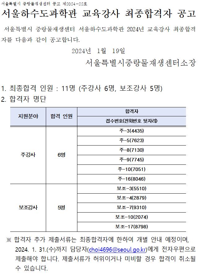 | 2024년 서울하수도과학관 교육강사 최종합격자 공고 | |||||